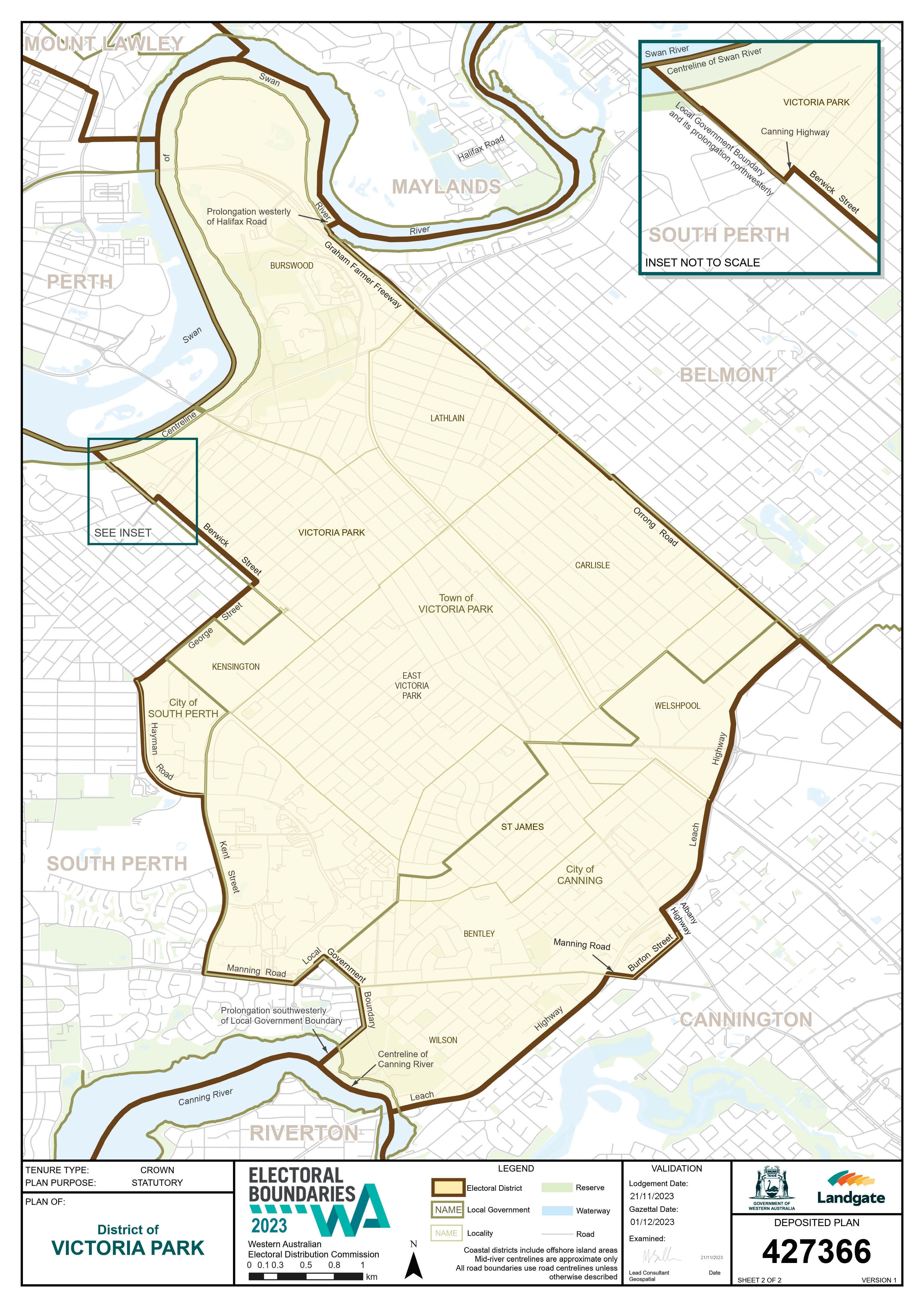 The electorate of Victoria Park includes all of Burswood, Carlisle, East Victoria Park, Lathlain, St James and Victoria Park. It also includes parts of Bentley, Kensington, Welshpool and Wilson.